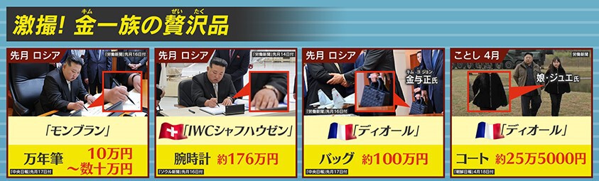 金総書記一族が身に着けている贅沢品ですが、金正恩総書記は約176万円といわれるIWCの時計や10万円以上するモンブランのペン、妹の金与正氏は、約100万円のディオールのバッグ、娘のジュエ氏は、約25万5000円のディオールのコートなどがカメラに写されています。
