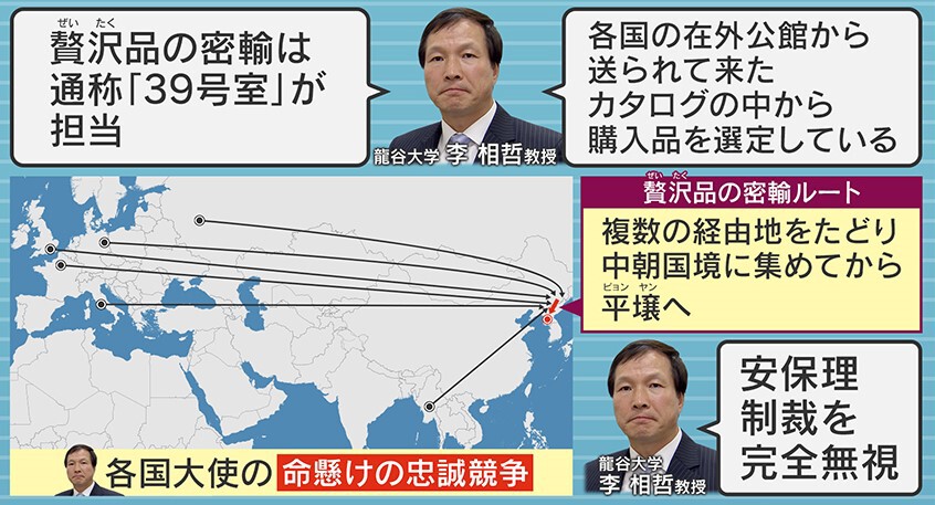 贅沢品の密輸ルートは、複数の経由地たどり、最終地点が分からないようにして中朝国境に集められるといいます。これは各国大使の命がけの忠誠競争だということで、安保理制裁を完全に無視しています。