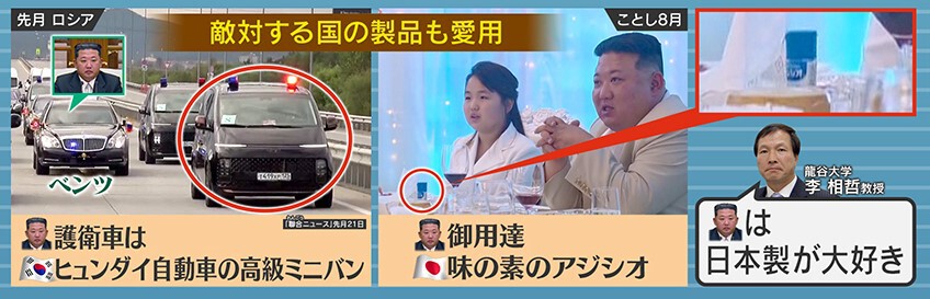 金正恩総書記は、敵対する国の製品も愛用しているということです。例えば、9月にロシアを訪問したときに、金総書記はベンツに乗っていましたが、護衛車は韓国のヒュンダイ自動車の高級ミニバンでした。8月に北朝鮮国内の宴会の様子を写した写真には味の素の「アジシオ」が写っていました。
