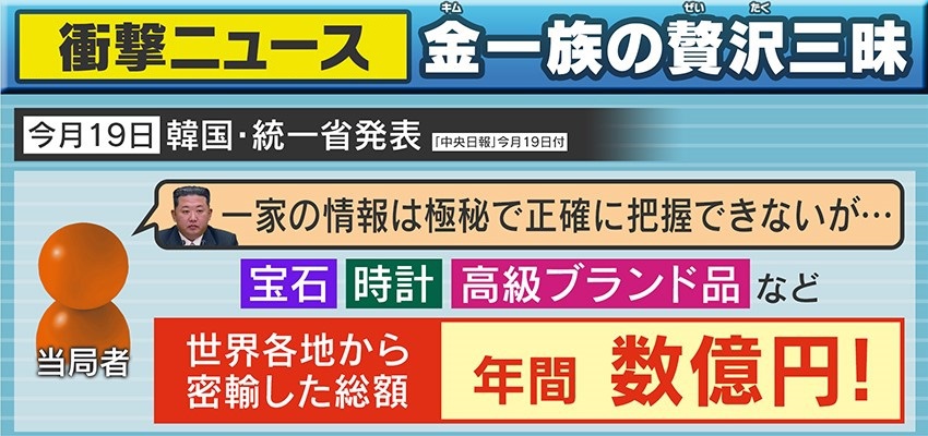 韓国・統一省の当局者によりますと、「金総書記一族の情報は極秘で正確には把握できないが、宝石・時計・高級ブランド品など世界各地から密輸した贅沢品の総額は年間数億円にのぼる」ということです。
