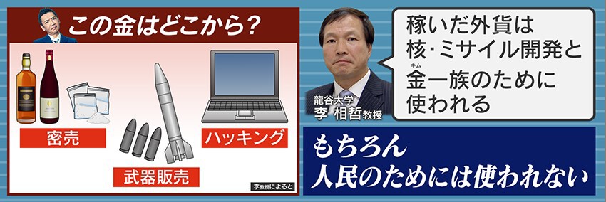 贅沢品の調達資金はどこから出ているのでしょうか?李教授によると、密売や武器の販売、ハッキングなどで外貨を集めているということです。李教授は「稼いだ外貨は、核・ミサイル開発と金一族のために使われる」と話します。「もちろん人民のためには使われない」ということす。
