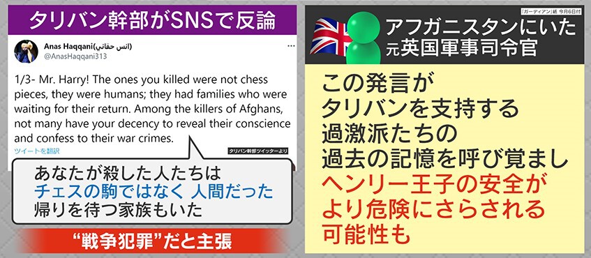 このヘンリー王子の発言に、タリバン幹部がSNSで、「あなたが殺した人たちはチェスの駒ではなく人間だった。帰りを待つ家族もいた」と反論し、戦争犯罪だと主張しています。また、アフガニスタンにいた元イギリス軍事司令官は、「このヘンリー王子の発言によって、王子の安全がより危険にさらされる可能性もある」と警告を発しています。