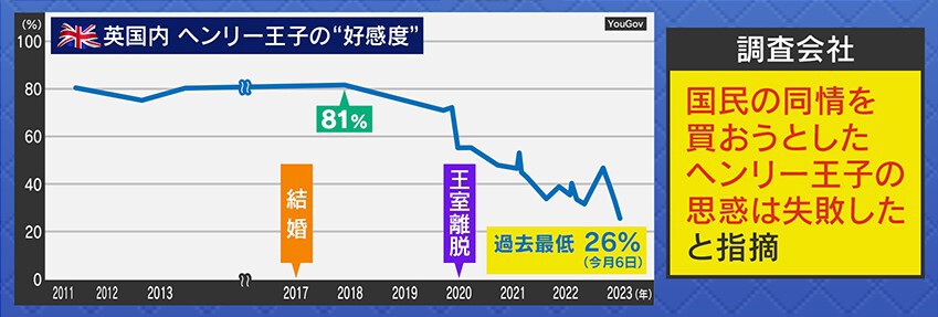 また、世代によって違いはありますが、イギリス国内のヘンリー王子の好感度データは、王室離脱前は80パーセント前後あったのが、1月6日の調査では過去最低の26%になっています。調査会社は「国民の同情を買おうとしたヘンリー王子の思惑は失敗した」と指摘しています。