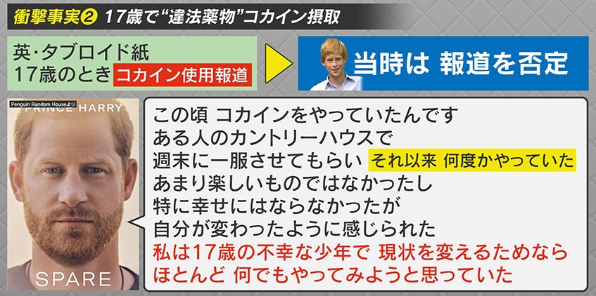ほかにも本の中では、当時は否定していた17歳のころのコカイン使用の話に触れて、「この頃 コカインをやっていたんです。ある人のカントリーハウスで週末に一服させてもらいそれ以来何度かやっていた。あまり楽しいものではなかったし、特に幸せにはならなかったが、自分が変わったように感じられた。私は17歳の不幸な少年で現状を変えるためならほとんど何でもやってみようと思っていた」と書かれています。