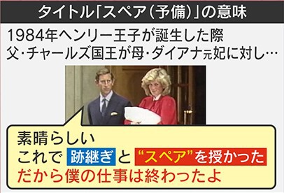 ヘンリー王子の回顧録「スペア」は、全416ページの本で、契約金が60億円だといいます。タイトル「スペア」に込められた意味は、1984年ヘンリー王子が誕生した際に父チャールズ国王が、母ダイアナ元妃に対して発した言葉、「これで跡継ぎと『スペア』を授かった、だから僕の仕事は終わった」にあり、この発言を二十歳のときに聞いたヘンリー王子の「自分はスペアだ、兄が跡継ぎ。父やエリザベス女王でさえスペアと言っていた。私はプランB、何かが起こったときのためこの世に生を受けた」という憤りを表したといいます。