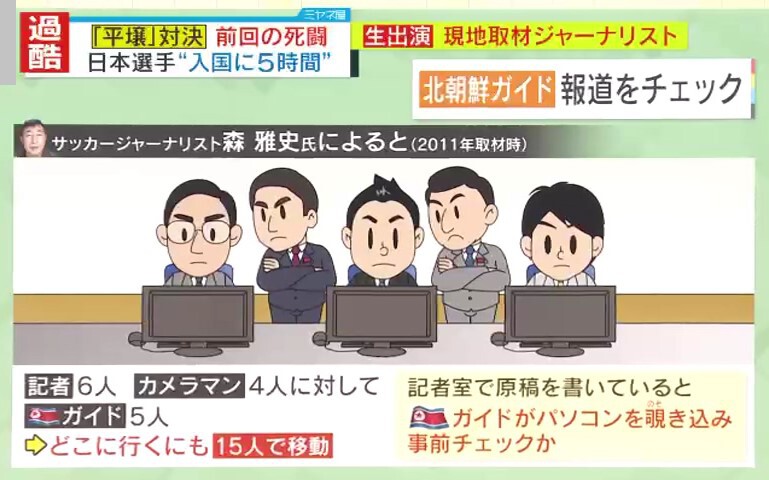 また、森氏によると、記者6人・カメラマン4人に対して北朝鮮側のガイド5人がどこに行くにもついてきて、常に15人で移動していたといいます。記者室で原稿を書いているとガイドがパソコンを覗き込み、事前チェックをしていたとみられるということです。