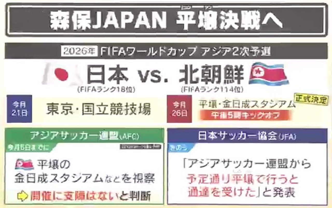 『2026年FIFAワールドカップ』アジア2次予選・日本vs.北朝鮮は、東京・国立競技場(2024年3月21日)と平壌・金日成スタジアム(同年3月26日)の“ホーム・アンド・アウェー”で行われます。「アジアサッカー連盟(AFC)」は3月5日までに平壌・金日成スタジアムなどを視察し、開催に支障はないと判断。「日本サッカー協会(JFA)」は3月11日、「アジアサッカー連盟から予定通り平壌で行うと通達を受けた」と発表しました。