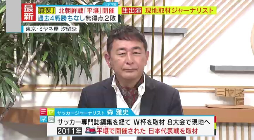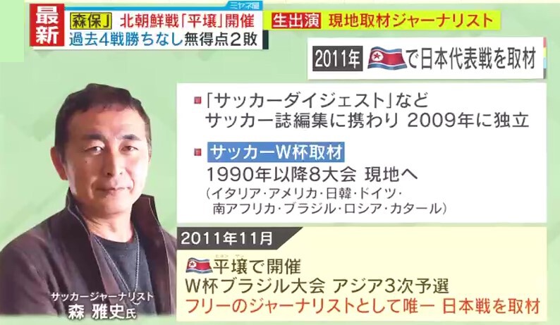 今回の一連の“ゴタゴタ”について解説いただく森雅史氏は、「サッカーダイジェスト」などサッカー誌編集に携わり、2009年に独立。サッカーW杯の取材は、1990年以降イタリア・アメリカ・日韓・ドイツ・南アフリカ・ブラジル・ロシア・カタールの8大会、現地に向かいました。そして2011年11月、北朝鮮・平壌で開催されたW杯ブラジル大会アジア3次予選を唯一取材したフリージャーナリストです。