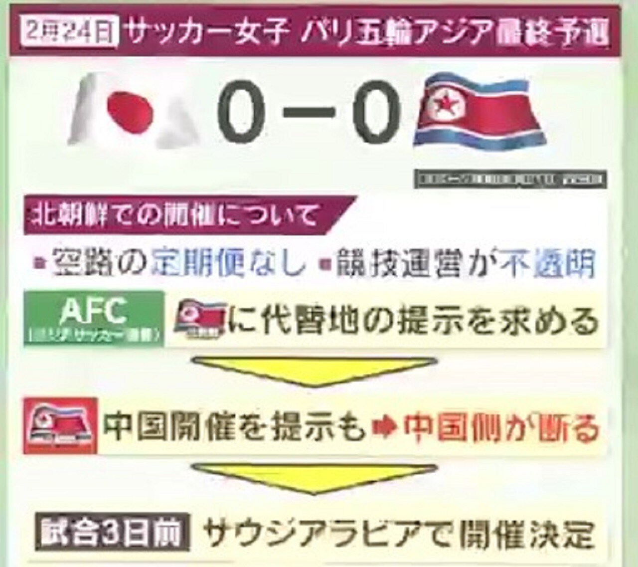 また、2024年2月24日に行われたサッカー女子・パリ五輪アジア最終予選では、北朝鮮での開催について「空路の定期便がない」「競技運営が不透明である」などから代替地の提示を求められ、北朝鮮は中国開催を提示したものの、中国側が拒否。サウジアラビアでの開催が決定したのは、試合3日前でした。