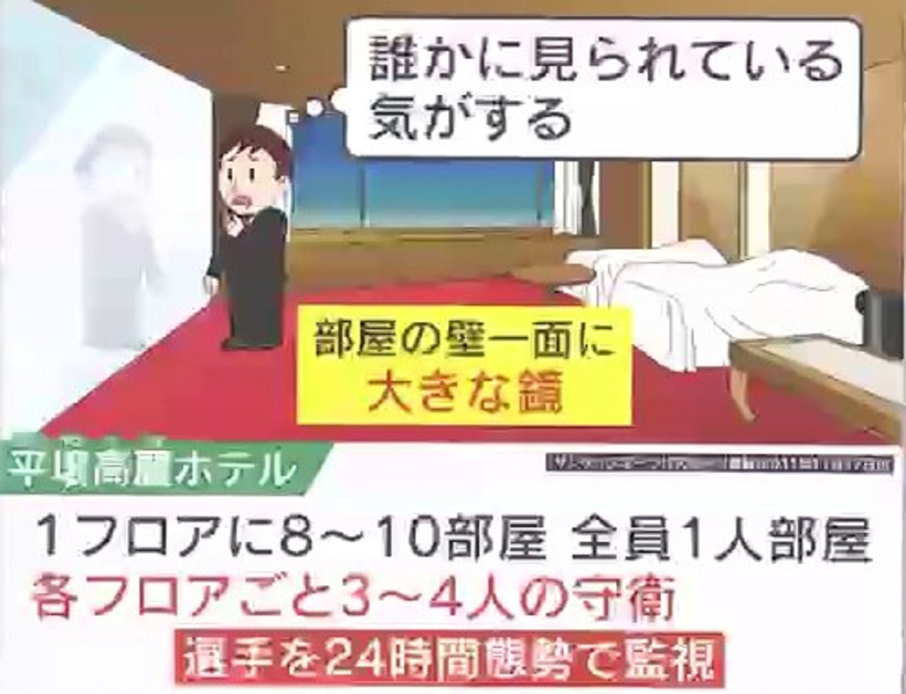 日本代表が宿泊した「平壌高麗ホテル」の部屋には、壁一面に大きな鏡があって、誰かに見られている気がすると感じていたといいます。1フロアに8~10部屋あり、全員が1人部屋で、各フロアに3~4人いる守衛が24時間態勢で監視していたということです。