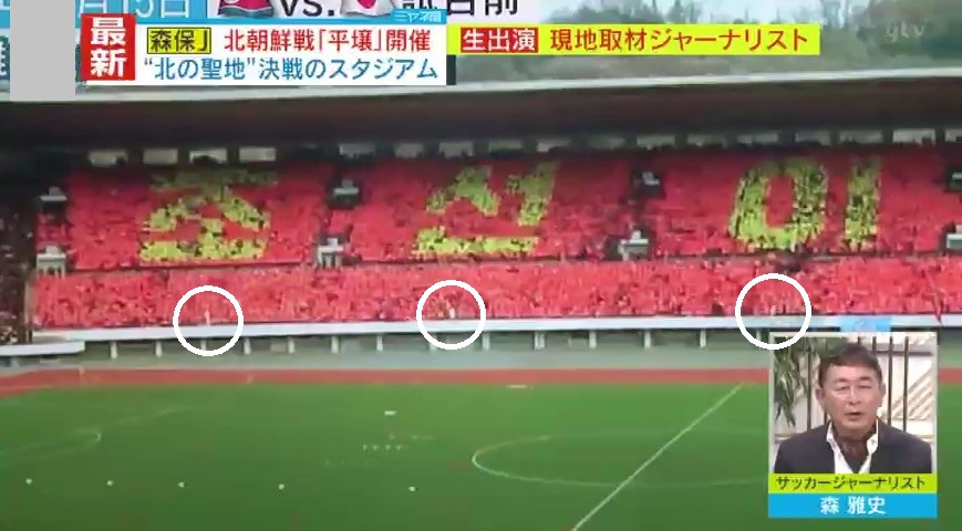 スタジアムは「ピッチサイド・ゴール裏など看板広告なし」「国歌斉唱では『君が代』がかき消されるほどのブーイング」「試合終了後、母国勝利に5分以上も歓声止まず」という異様な雰囲気でした。森氏は、マスゲームを彷彿とさせる“人文字”で「朝鮮 勝て」と応援を展開する観客席を、現場で目撃したといいます。