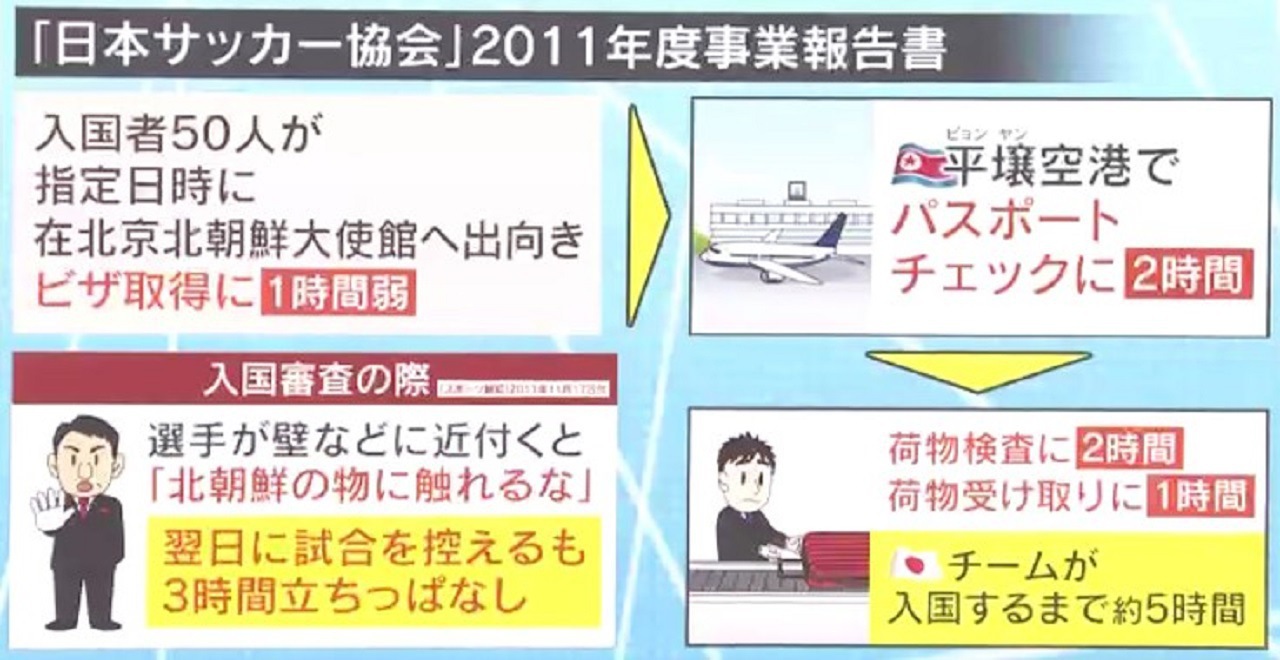 「日本サッカー協会」2011年度事業報告書によると、入国者50人が指定日時に在北京北朝鮮大使館へ出向きましたが、ビザ取得に1時間弱かかりました。また、平壌空港ではパスポートチェックに2時間・荷物検査に2時間・荷物受け取りに1時間と、入国するまでに約5時間かかったといいます。入国審査の際には、選手が壁などに近づいただけで「北朝鮮の物に触れるな」と言われ、翌日に試合を控えているにも関わらず3時間立ちっぱなしでした。