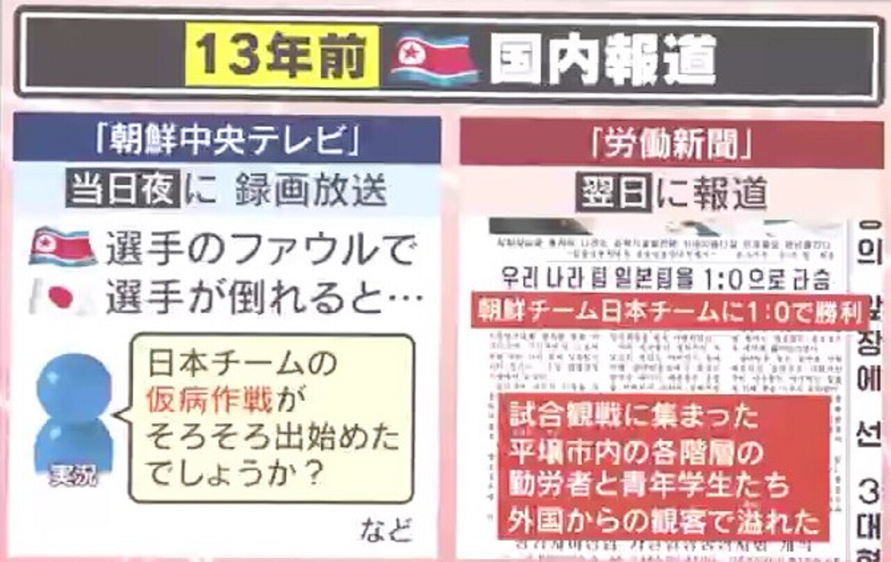 一方、北朝鮮国内での報道のされ方ですが、「朝鮮中央テレビ」が当日夜に録画放送し、北朝鮮選手のファウルで日本選手が倒れると「日本チームの仮病作戦がそろそろ出始めたでしょうか?」などと実況。「労働新聞」は翌日、「朝鮮チーム、日本チームに1-0で勝利。試合観戦に集まった平壌市内の各階層の勤労者と青年学生たち、外国からの観客で溢れた」と伝えました。