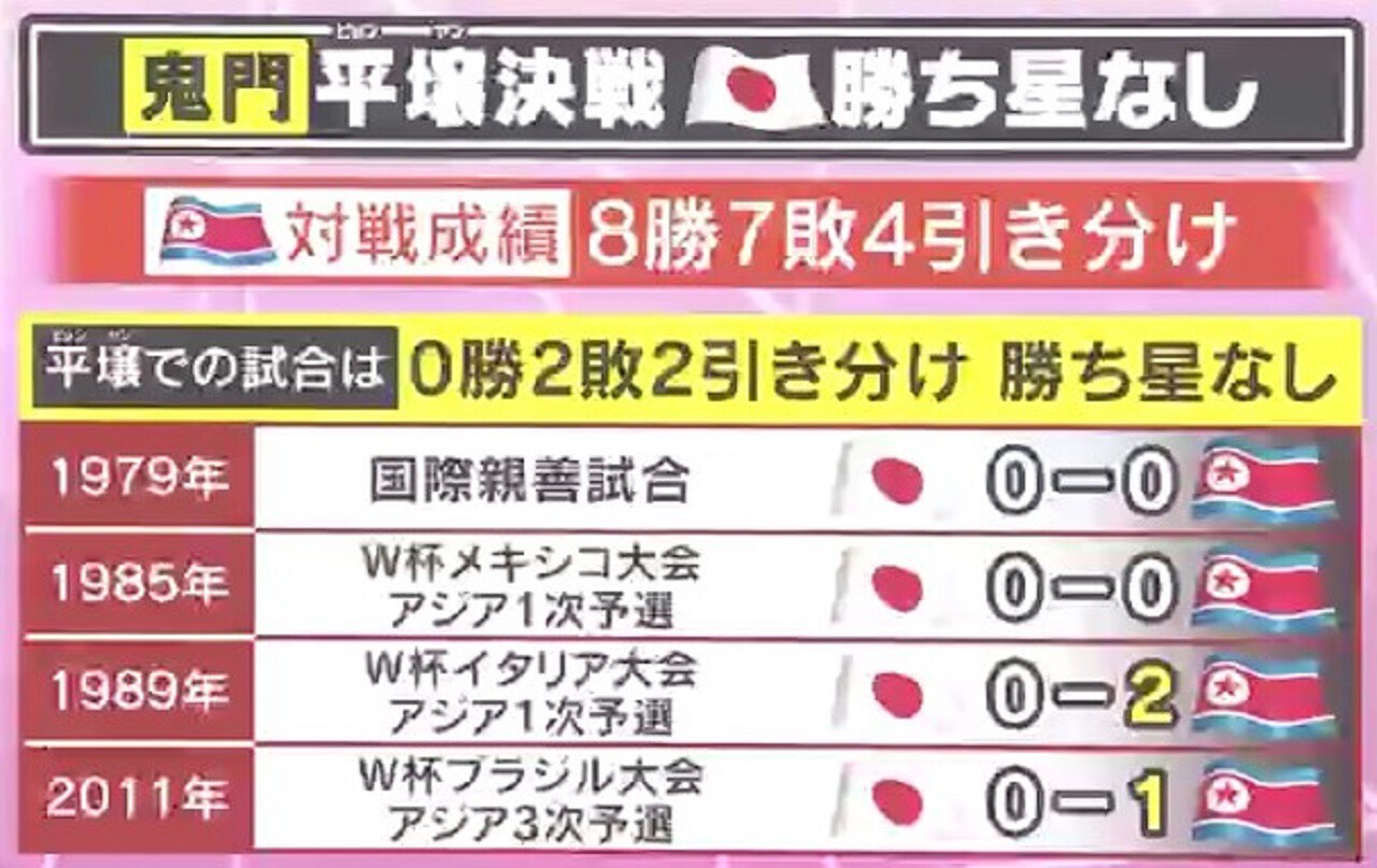 と、平壌開催での試合に限ると『0勝2敗2引き分け』で、勝ち星がありません。