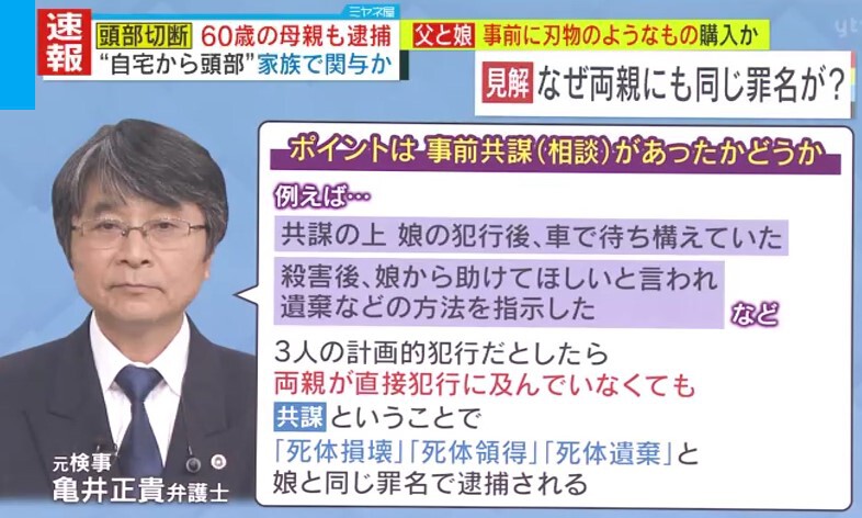 では、なぜ全員が同じ容疑で逮捕されたのでしょうか?元検事の弁護士・亀井正貴氏によると、事前共謀(相談)があったかどうかがポイントで、例えば「共謀の上、娘の犯行後、車で待ち構えていた」、または「殺害後、娘から助けてほしいと言われ、遺棄などの方法を指示した」など、3人の計画的犯行だとしたら、両親が直接犯行に及んでいなくても、共謀ということで、「死体損壊」「死体領得」「死体遺棄」と娘と同じ罪名で逮捕されるということです。