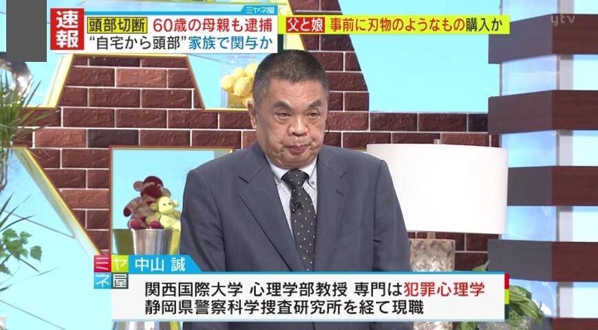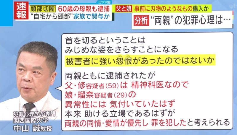 遺体の頭部を持ち帰ったことの心理として、中山氏は「首を切るということは、みじめな姿をさらすことになる。被害者に強い怨恨があったのではないか。両親ともに逮捕されたが、父・修容疑者は精神科医なので、娘・瑠奈容疑者の異常性には気付いていたはず。本来、助ける立場であるはずが、両親の同情・愛情が優先し、罪を犯したと考えられる」と分析しています。