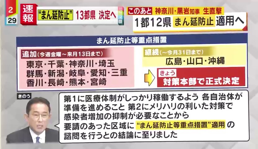 オミクロン株が猛威を振い、感染者も第5波のピークを超え急増しています。政府は東京など1都12県について“まん延防止”措置を適用。岸田総理は「第1に医療体制がしっかり稼働するよう各自治体が準備を進めること、第2にメリハリのついた対策で感染者の増加の抑制が必要だ」と話しています。また分科会の尾身会長は、「人流抑制ではなく、人数制限がキーワード、ステイホームは必要ない」と語りました。