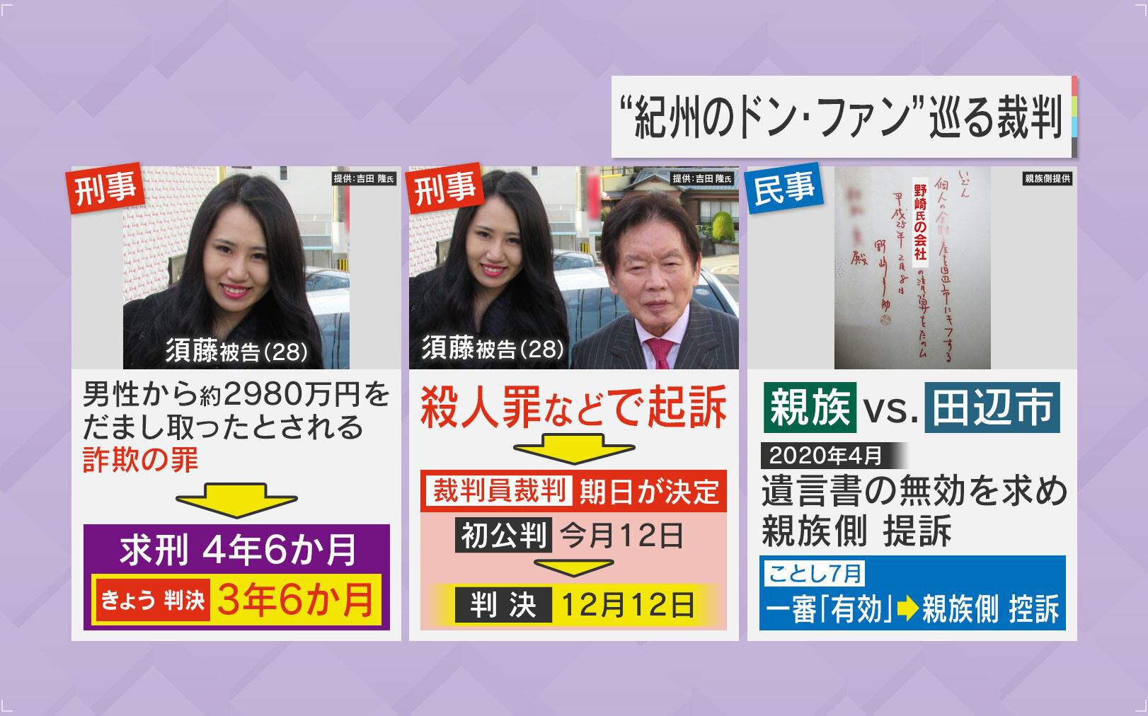 “紀州のドン・ファン”を巡る裁判には、今回判決が出た詐欺事件のほかに、野崎氏の13億円を超える遺産を巡り、親族と田辺市の間で「遺言書の有効性」を争った民事裁判があます。こちらは、先日行われた一審で「遺言書は有効」との判決が出ましたが、親族側が控訴しています。