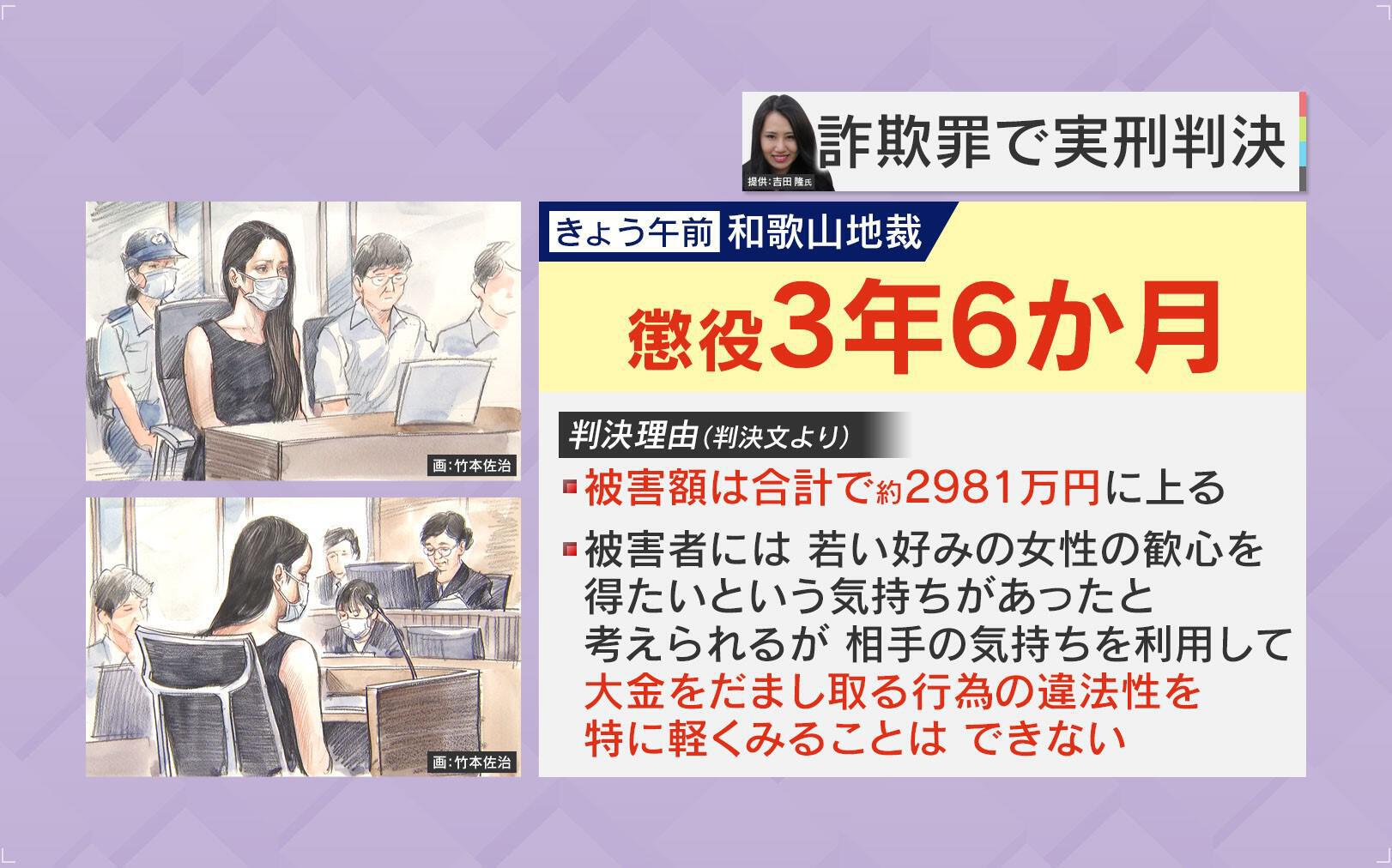 判決文によると、「被害額が合計で約2981万円に上ること」や「被害者には、若い好みの女性の歓心を得たいという気持ちがあったと考えられるが、相手の気持ちを利用して大金をだまし取る行為の違法性を特に軽く見ることはできない」などが判決理由ということです。