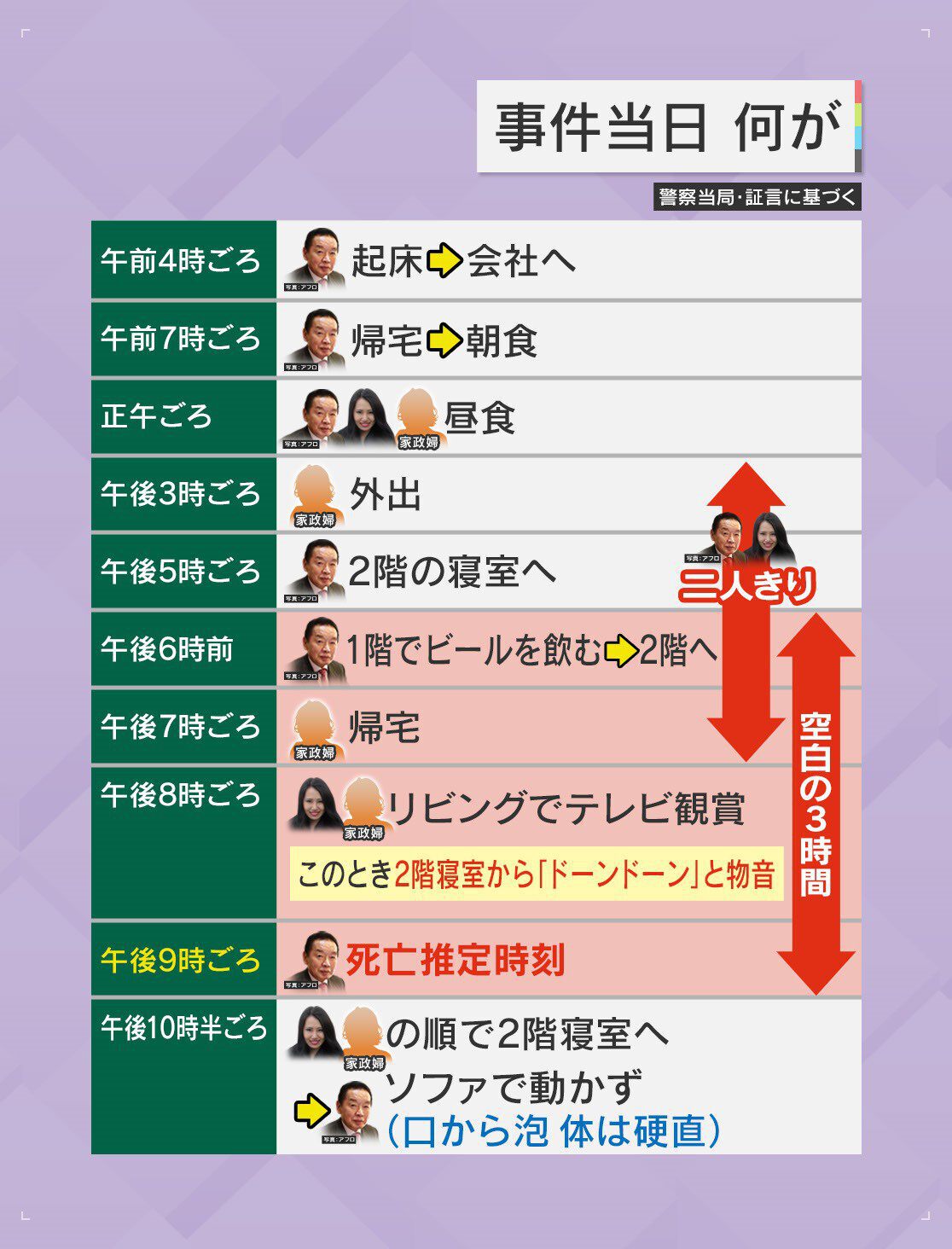 警察によると、死亡推定時刻は午後9時頃とのことで、野崎氏が2階に上がってから死亡推定時刻まで、空白の3時間となっています。