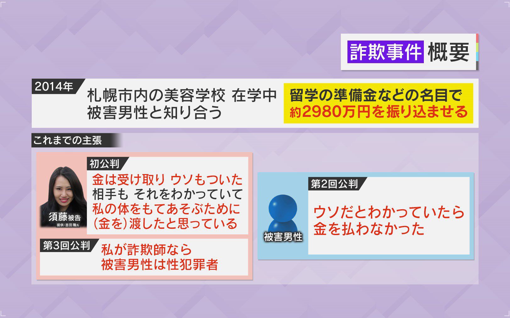 これまで須藤被告は「金は受け取り、ウソもついた。相手もそれをわかっていて、私の体をもてあそぶために(金を)渡したと思っている」とウソは認めていました。そして、「私が詐欺師なら被害男性は性犯罪者」と主張していました。