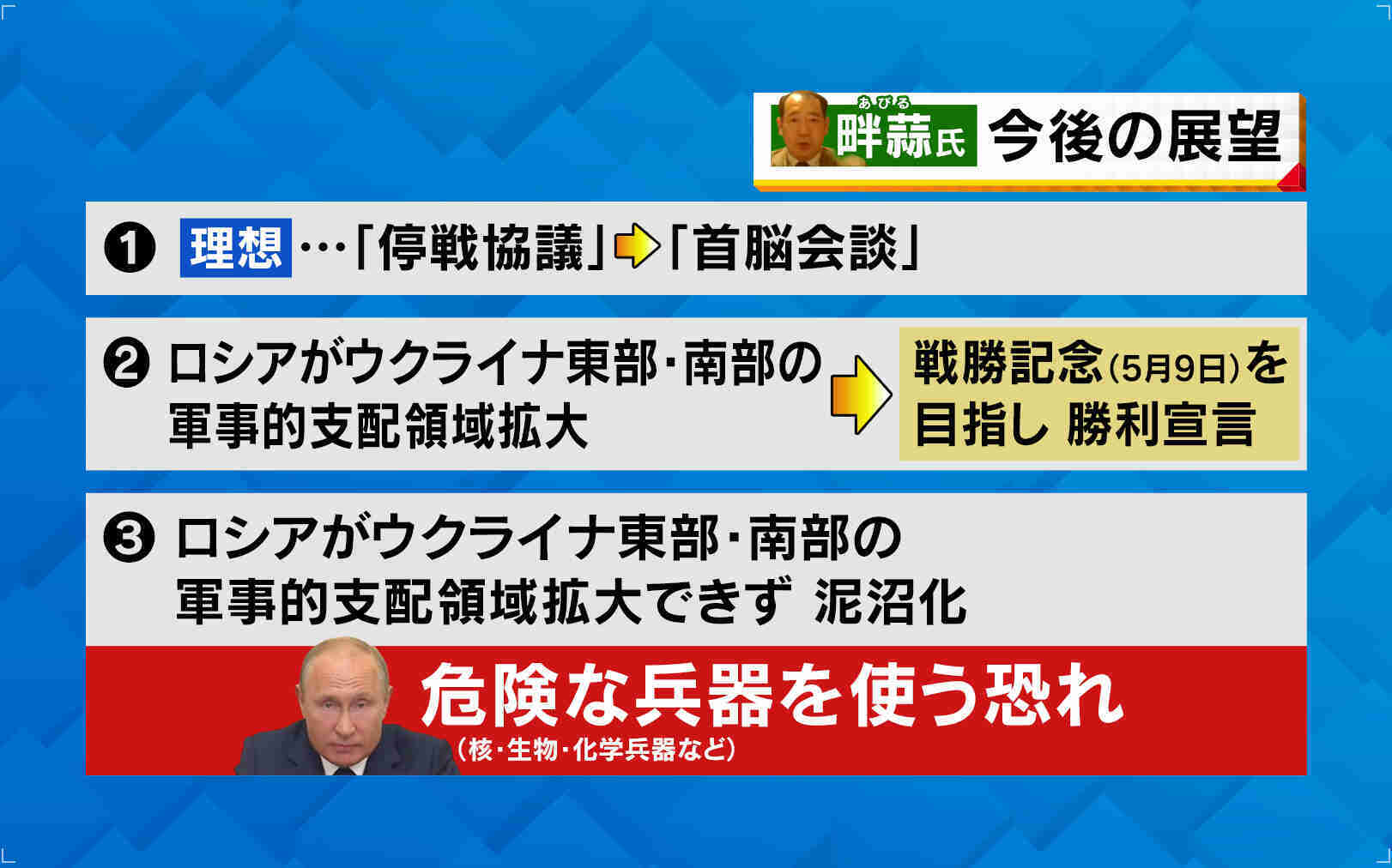 「ウクライナ東部でも、ロシアが勝利宣言できない状況に追い込まれたときに、核や生物兵器まではいかなくても、化学兵器を使う可能性は出てくる懸念はあります」