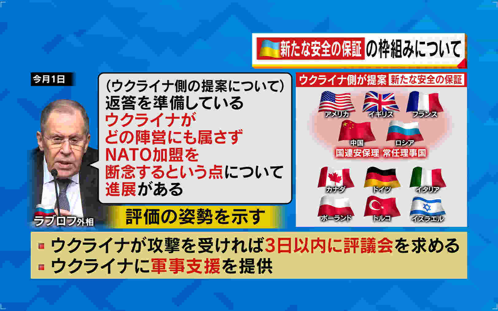 Q.ウクライナが提案した、ウクライナの停戦後の新たな安全の保障の枠組みなんですが、アメリカ・イギリス・フランス・中国・ロシアの国連常任理事国とドイツ、イタリア、ポーランド、トルコ、イスラエルということで、ほぼNATO(北大西洋条約機構)と中国、ロシアでなんですが、これは実現可能なんですか?
