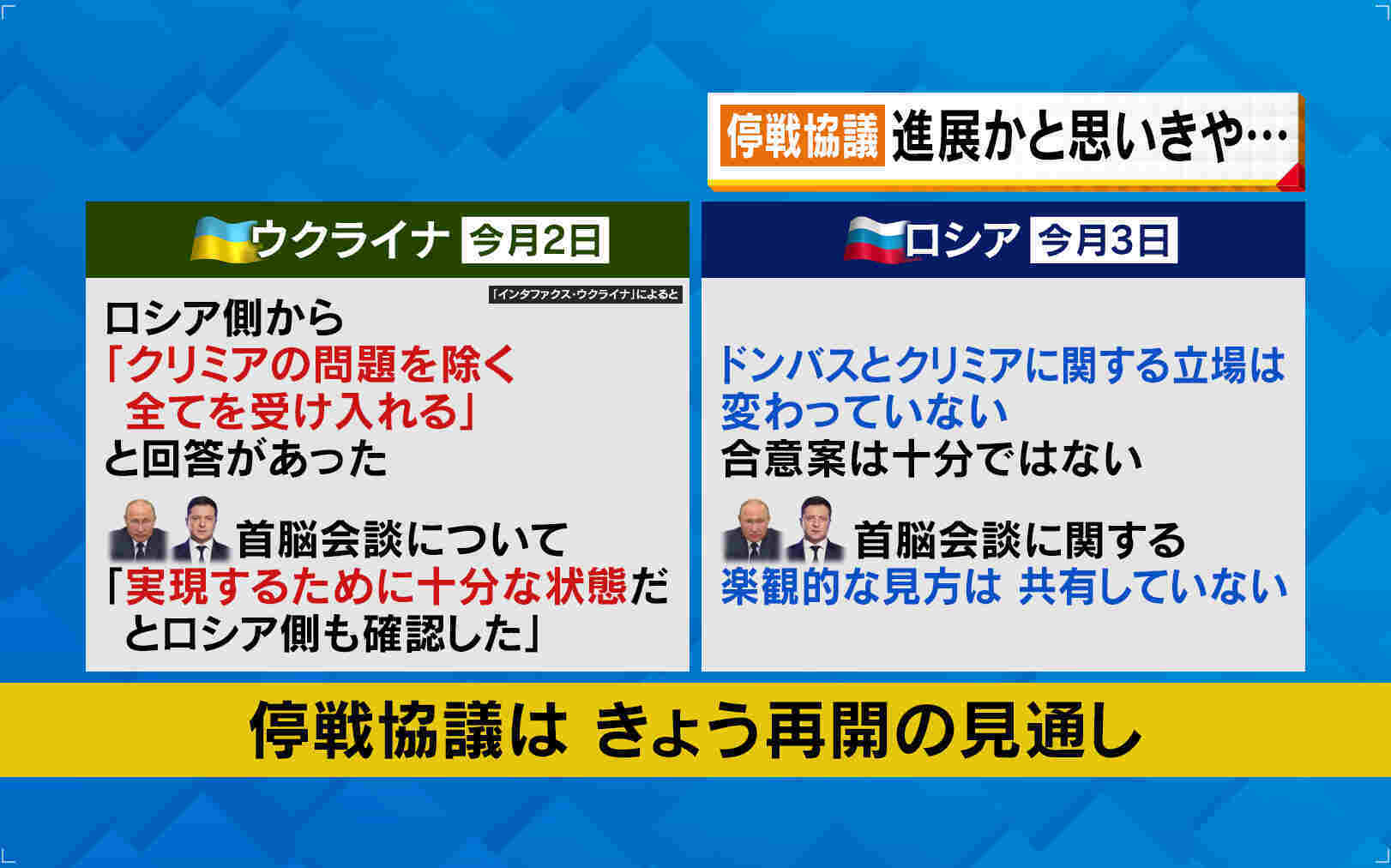 ウクライナ側は4月2日、「ロシア側から『クリミアの問題を除く全てを受け入れる』と回答があった。首脳会談についても、実現するために十分な状態だとロシア側も確認した」と発表し、進展しているかのように見えた停戦協議ですが、一方でロシアは「ドンバスとクリミアに関する立場は変わっていない。合意案は十分ではない。首脳会談に関する楽観的な見方は共有していない」と相反する発表をしました。