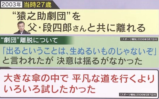 2003年、段四郎さんは当時27歳だった猿之助さんと共に、猿翁さんが率いる劇団を一度離れたことがありました。猿之助さんは離脱について、「『出るということは、生ぬるいものじゃない』と言われたが、決意は揺るがなかった。大きな傘の中で平凡な道を行くより、いろいろ試したかった」と語っていました。