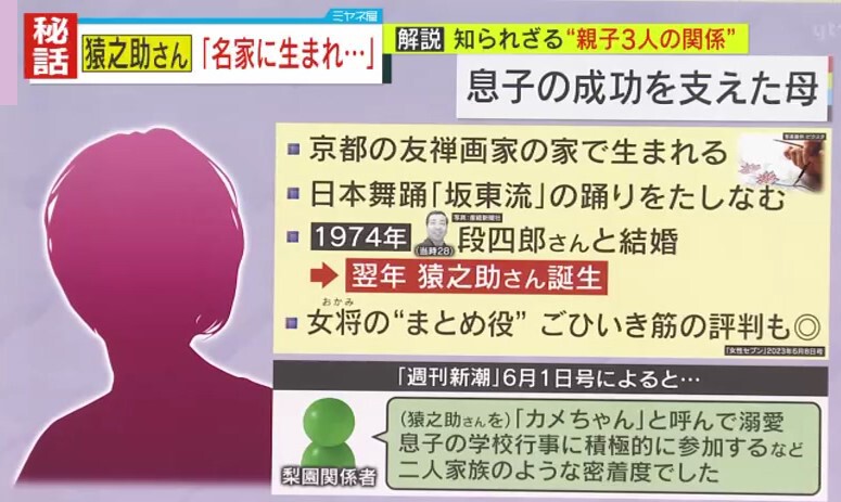猿之助さんのお母様は、京都の友禅画家の家に生まれ、日本舞踊「坂東流」の踊りをたしなみました。1974年に段四郎さんと結婚し、翌年に猿之助さんが誕生。女将の“まとめ役”として、ごひいき筋の評判も大変良かったということです。また、梨園関係者によりますと、猿之助さんを「カメちゃん」と呼んで溺愛していて、学校行事には積極的に参加するなど、ずっと猿之助さんを支えていたといいます。