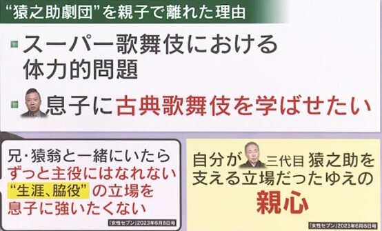 猿翁さんの劇団を親子で離れた背景には、スーパー歌舞伎における段四郎さんの体力的問題と、「息子に古典歌舞伎を学ばせたい」という思いもありました。また、「猿翁と一緒にいたら、ずっと主役にはなれない。“生涯、脇役”の立場を、息子に強いたくない」という、ご自身が猿翁さんを支える立場だったが故の親心もあったといいます。