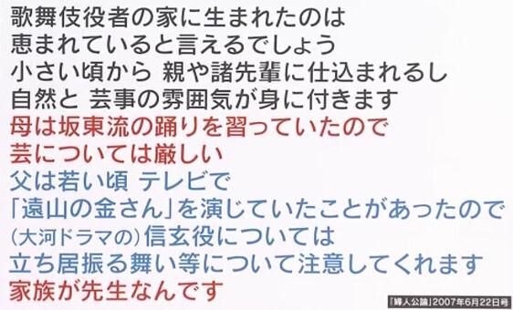 猿之助さんは以前、インタビューで「母は坂東流の踊りを習っていたので、芸については厳しい。父は若い頃テレビで『遠山の金さん』を演じていたことがあったので、大河ドラマの信玄役については、立ち振る舞い等について注意してくれます。家族が先生なんです」と、ご両親のことを話していました。