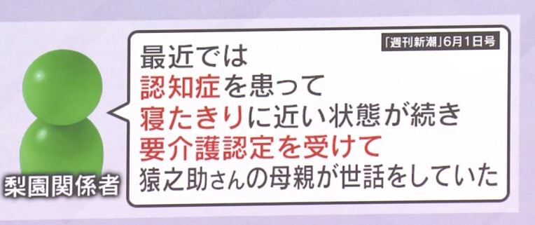 そんな段四郎さんですが、近年は体調が優れず、舞台から遠ざかっていました。最近の段四郎さんについて、歌舞伎評論家は「肝臓がんを患っており、自宅で療養していると聞いた。それ以前からセリフを覚えるのに苦労していたようだ」と話しており、梨園関係者も「認知症を患って、寝たきりに近い状態が続き、要介護認定を受けて、猿之助さんの母が世話をしていた」と話していたということです。