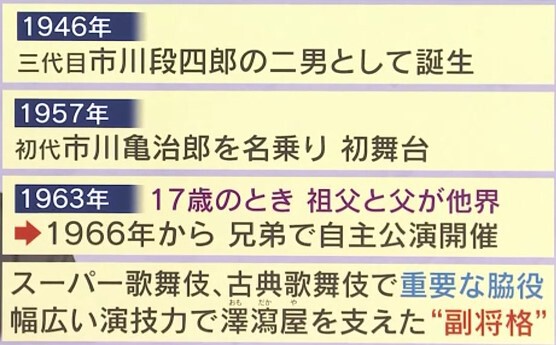 “名優”と呼ばれた猿之助さんの父・市川段四郎さんは、初代・市川亀治郎を名乗り活躍していましたが、17歳の時に祖父と父が他界しました。1966年から兄・猿翁さんと自主公演を開催し、スーパー歌舞伎・古典歌舞伎で重要な脇役を担い、幅広い演技力で澤瀉屋を支えた“副将格”です。