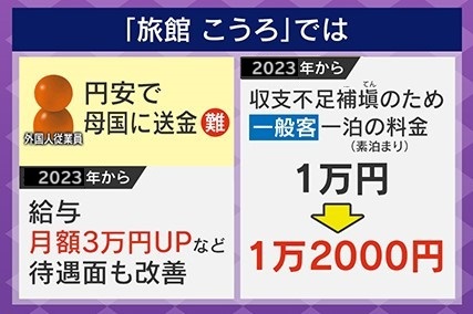 また、「旅館 こうろ」では外国人従業員が円安で母国に送金が難しくなってしまったため、2023年から給与を月額3万円アップするなど待遇面を改善したということです。さらに、収支不足を補てんするために、一般客の素泊まり1泊の料金を1万円から1万2000円に値上げしたということです。