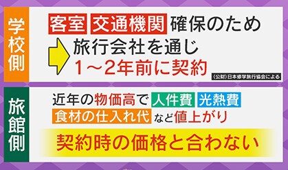 なぜ受け入れると経営が圧迫してしまうのでしょうか?「日本修学旅行協会」によると、修学旅行は多くの客室や交通機関の確保が必要なため、学校側は旅行会社を通じて1~2年前に契約をするということですが、旅館側としては近年の物価高で人件費・光熱費・食材の仕入れ代などが値上がりしていて、契約時と価格が合わないということがあります。