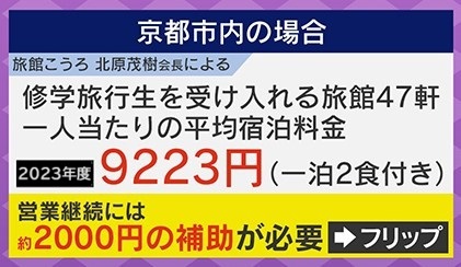 北原会長によると、京都市の修学旅行生を受け入れる旅館47軒の、一人当たりの平均宿泊料は2023年度の場合1泊2食付きで9223円だといいます。営業継続には約2000円の補助が必要だとのことです。
