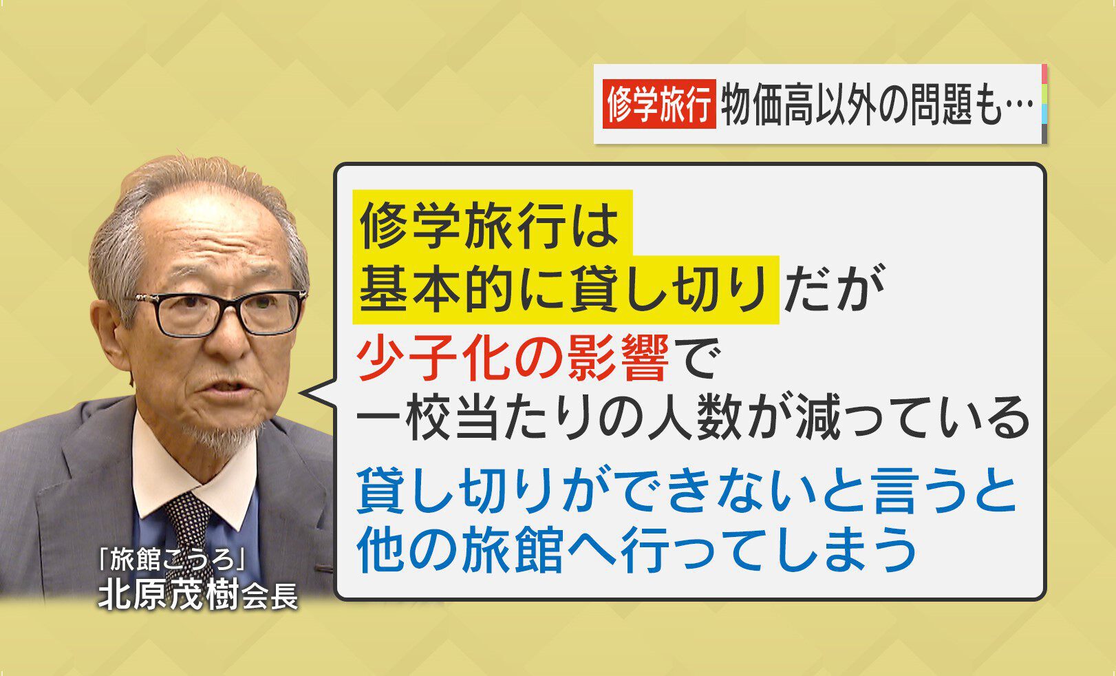 北原会長は、「修学旅行は基本的に貸し切りだが、少子化の影響で一校当たりの人数が減っている。貸し切りができないと言うと他の旅館に行ってしまう」と話しています。