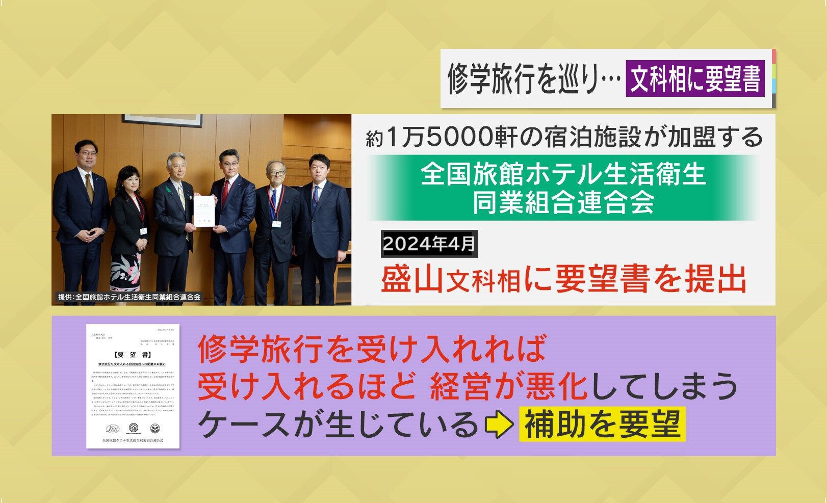 2024年4月、全国約1万5000軒の宿泊施設が加盟している「全国旅館ホテル生活衛生同業組合連合会」は森山文部科学大臣に「修学旅行を受け入れれば受け入れるほど経営が悪化してしまうケースが生じている」として補助を要望しました。
