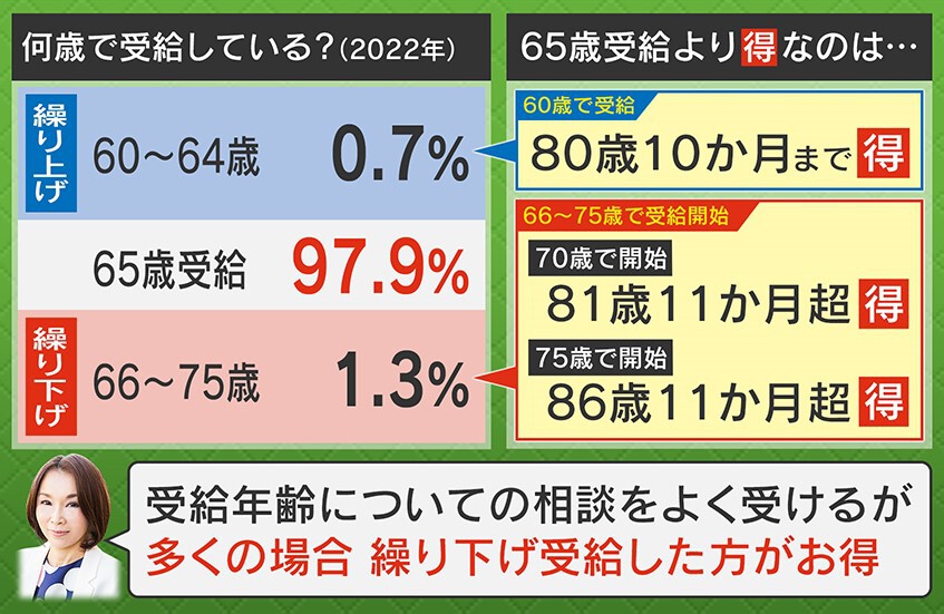 「年金というのは、『年金保険』なので、長生きのリスクに対しての保障だということです。今後医療や介護の負担が重くなったときに、年金がたくさんあった方が安心ですから、繰り下げをするという人が多くいます」