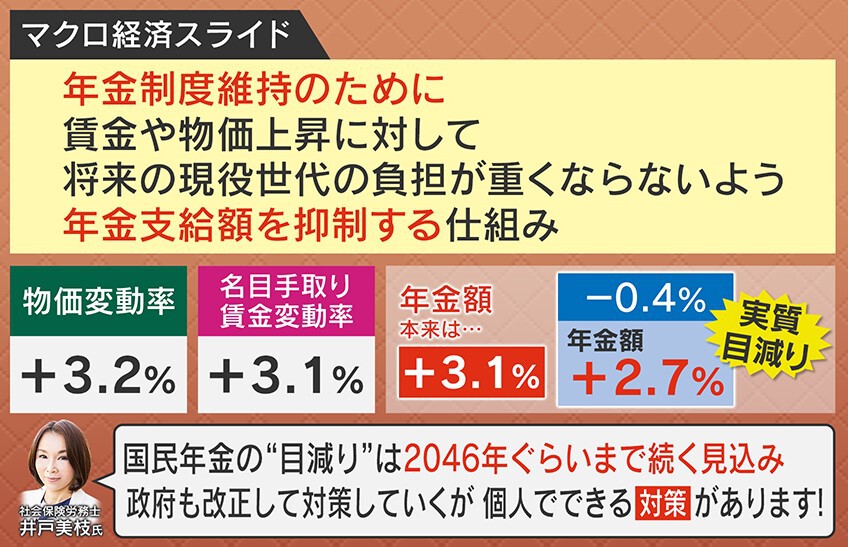 「私たちが払っている年金保険料は、固定されていて『これ以上は上げませんよ』という約束なんです。なので、受け取る方は『物価や賃金の上昇より少し下げた年金額に調整しますよ』ということになっています。しかし、“目減り”が20年続くというのは国民年金の場合で、厚生年金は2025年に解消される予定です」