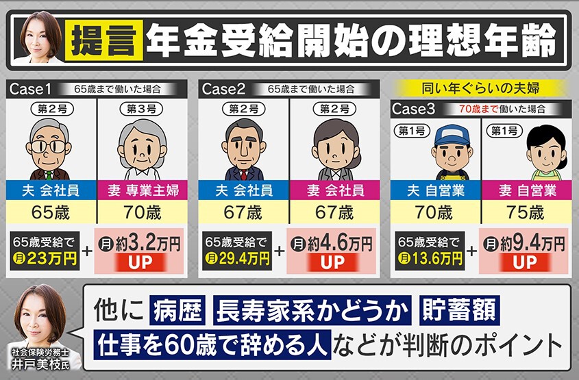 井戸氏の監修で、同い年くらいの夫婦での年金受給開始の理想年齢を出してみました。まず、夫は会社員・妻は専業主婦で65歳まで働いた場合、夫は65歳で受給スタート、妻は70歳で受給スタートが理想だということです。