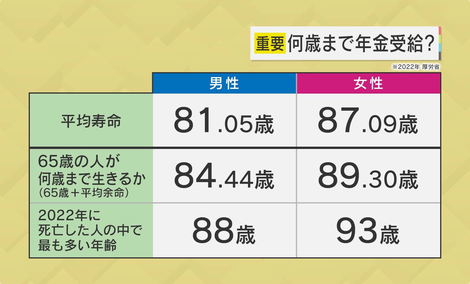 年金受給年齢を考えるときに多くの人が参考にするのが、「平均寿命」ですが、これには若くして亡くなった人も含まれるので、実際に参考になるデータがあります。その一つは「65歳の人が何歳まで生きるのか」です。この場合、男性が84.44歳、女性が89.30歳となっています。また「2022年に死亡した人の中で最も多い人の年齢」というデータもあって、男性は88歳、女性は93歳となります。