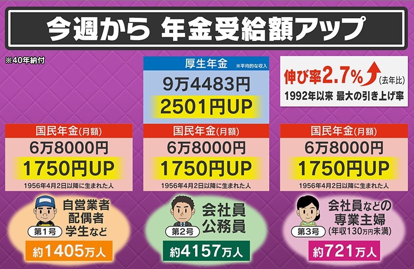 6月支給分から年金受給額が2.7%アップとなります。その内訳ですが、年金を40年納付した場合、国民年金が1750円アップ、会社員や公務員などの場合、国民年金に加え厚生年金が2501円のアップとなります。これは、1992年以来最大の引き上げ率となっています。平均的な収入で、40年間働いた場合のモデルケースでは、夫が会社員・妻が専業主婦の場合、夫婦で6001円のアップとなります。夫婦とも自営業の場合は、夫婦で3500円のアップ。夫婦ともに会社員の場合、夫婦で8502円のアップとなります。