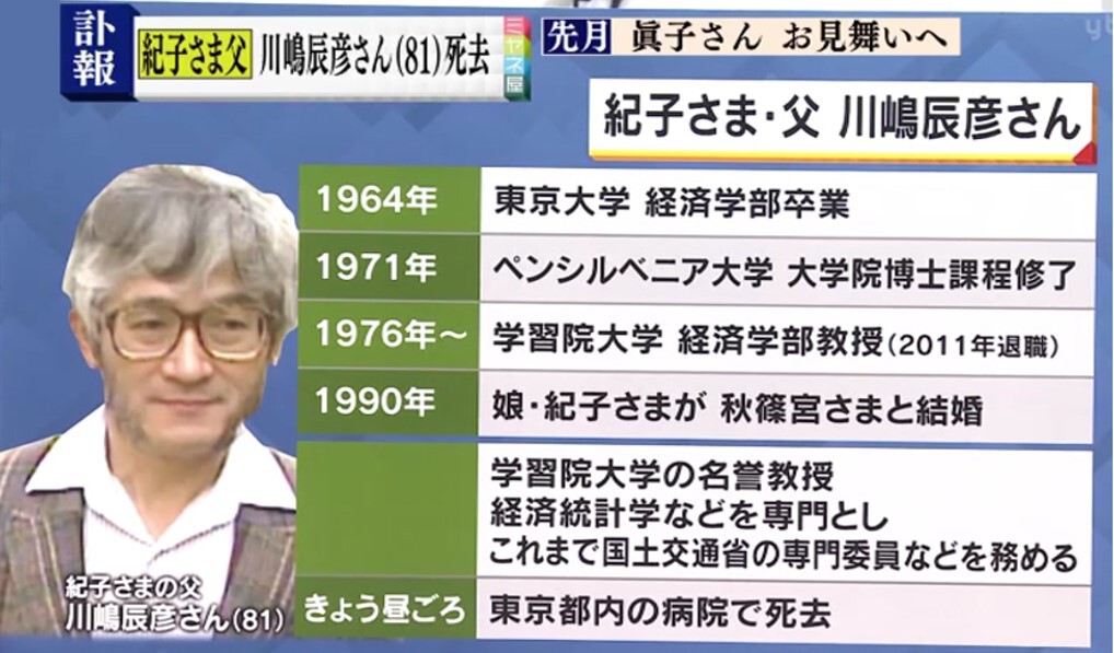 亡くなった川嶋辰彦さんは、1964年に東京大学経済学部卒業。1971年にペンシルベニア大学大学院博士課程修了。1976年から学習院大学経済学部教授(2011年退職)。1990年に娘・紀子さまが秋篠宮さまと結婚。学習院大学名誉教授に就任しました。経済統計学などを専門とし、国土交通省の専門委員なども務めました。