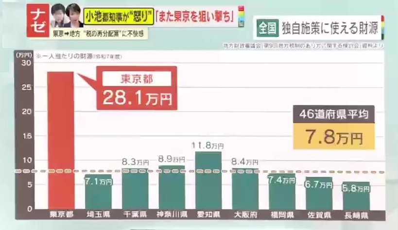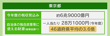 東京都の2025年度の税収見込みは約6兆9000億円です。総務省によると、自治体の独自政策等に使える財源は、一人当たりに換算すると、28万1000円で、46道府県平均の3.6倍だということです。