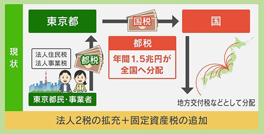 東京都の税収の現状ですが、東京都民・事業者は、法人住民税・法人事業税を都税として東京都に納めています。この都税が国税に切り替わって国に入り、地方交付税などとして分配されていて、その額が年間1.5兆円だといいます。