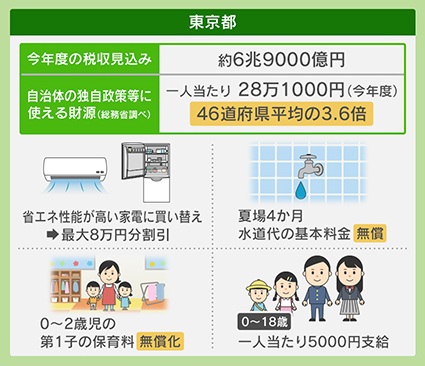 東京は税収が多いため、独自政策を行っていて、例えば、省エネ家電等に買い替える場合は最大8万円分の補助、水道料金も夏場は4か月基本料金無償や、0~2歳児の保育料の無償化、さらには0~18歳の子ども一人当たり月額5000円の支給などもしています。