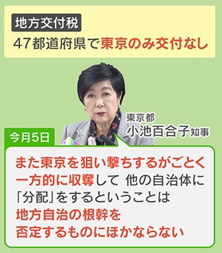 実は47都道府県で、東京のみ地方交付税の交付がありません。小池都知事は、「また東京を狙い撃ちするがごとく、一方的に収奪して、ほかの自治体に『分配』をするということは、地方自治の根幹を否定するものにほかならない」と話しています。