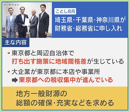 それに対し、2025年8月、埼玉県・神奈川県・千葉県が、財務省・総務省に申し入れを行いました。『東京都と周辺の自治体で打ち出す施策に地域間格差が生じている。大企業が東京都に本店や事業所を設けるので、東京都への税収集中が進んでいる』として、地方一般財源の総額の確保・充実などを求めました。